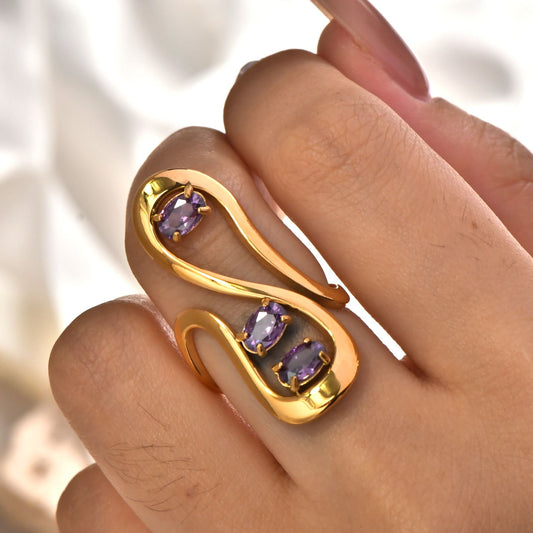Sortija Dorada Abierta con Detalles de Circonias Púrpuras