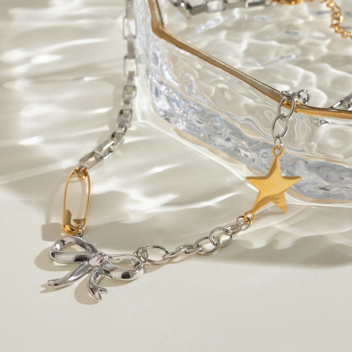 Un diseño único que mezcla la delicadeza y el estilo urbano en una sola pieza. Este collar presenta un lazo plateado en el centro, acompañado de una estrella dorada y un detalle tipo imperdible en tono oro, creando un contraste moderno y elegante. Su cadena combina eslabones rectangulares y ovalados, aportando dinamismo y versatilidad.
